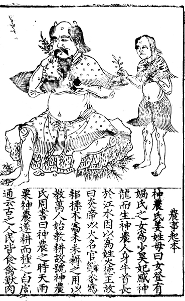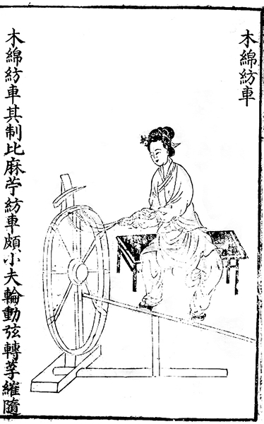 《王祯农书》书影,此书插图丰富,开篇讲述神农氏对农业的贡献(上图)。《王祯农书》花了许多篇幅介绍各种各样的农具(如下图所示木棉纺车),对于复原古代农具具有重要价值。
